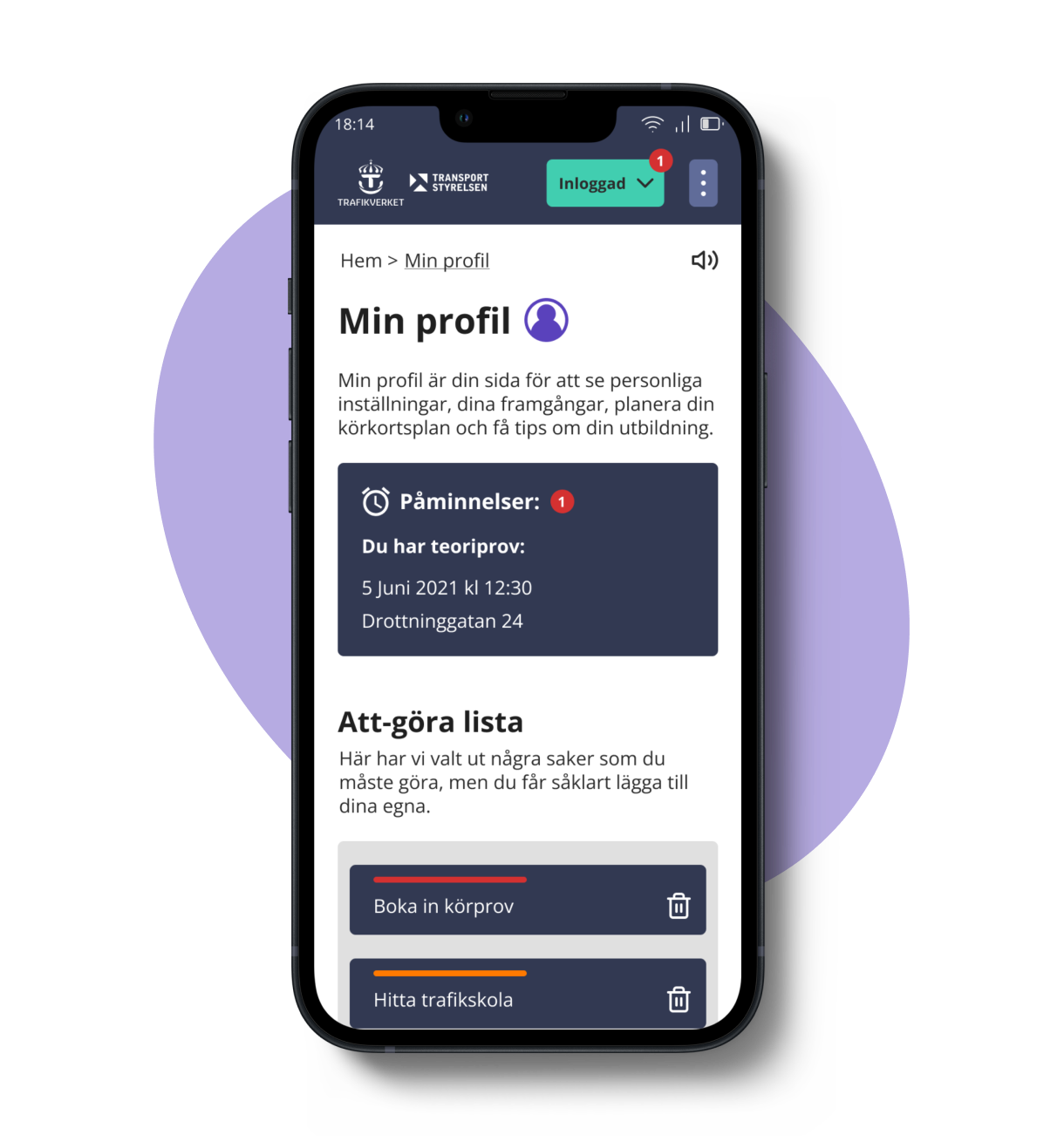 Using the identification app BankID, the website is integrated with Trafikverket and Transportstyrelsen, saving documentation and update you on upcoming events.
